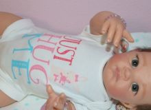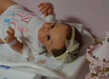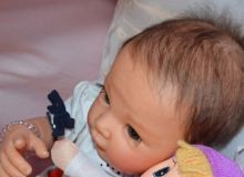 Poppet je zrebornovaná z obľúbenej stavebnice návrhárky Adrie Stoete. Je pekne namaľovaná vo viacerých vrstvách, nechýbajú žilky na tvári a končatinách, červeň, zosvetlenie a tiene tak, ako vyzerá naozajstná novorodenecká pokožka a samozrejme i realistické dlane a chodidlá a manikúra na nechtíkoch. Vlásky sú po jednom vpichované v rôznych smeroch tak, aby vytvárali reálny vzhľad :-). Sú krásne a jemnučké na dotyk. Poppet má vo vnútri pusinky vlepený magnet na uchytenie cumlíka. Veľmi rada pracujem s bábikami od Adrie Stoete má nádherné kity.